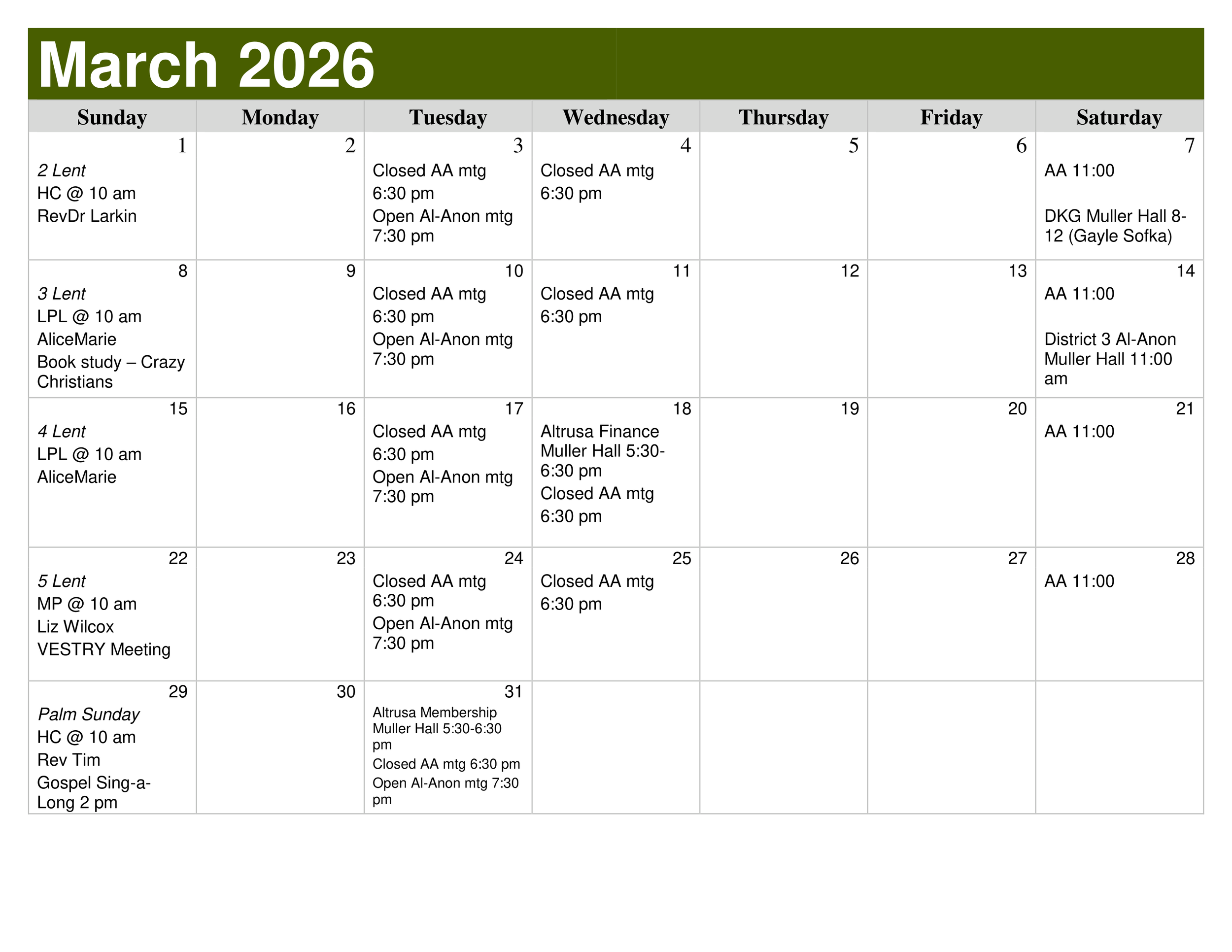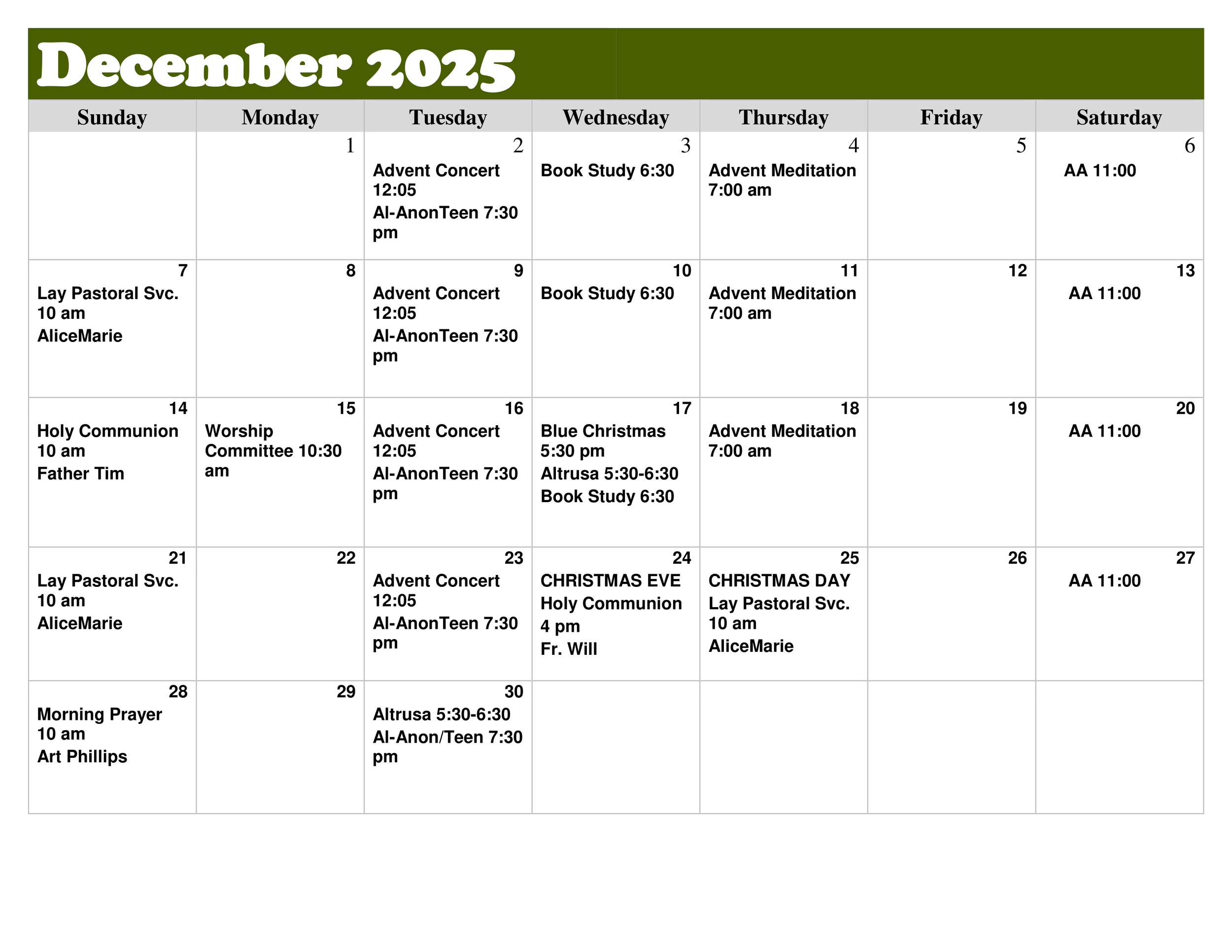 Worship, aa, al-anon, Special Events, and more ~ Join us for something This Month!