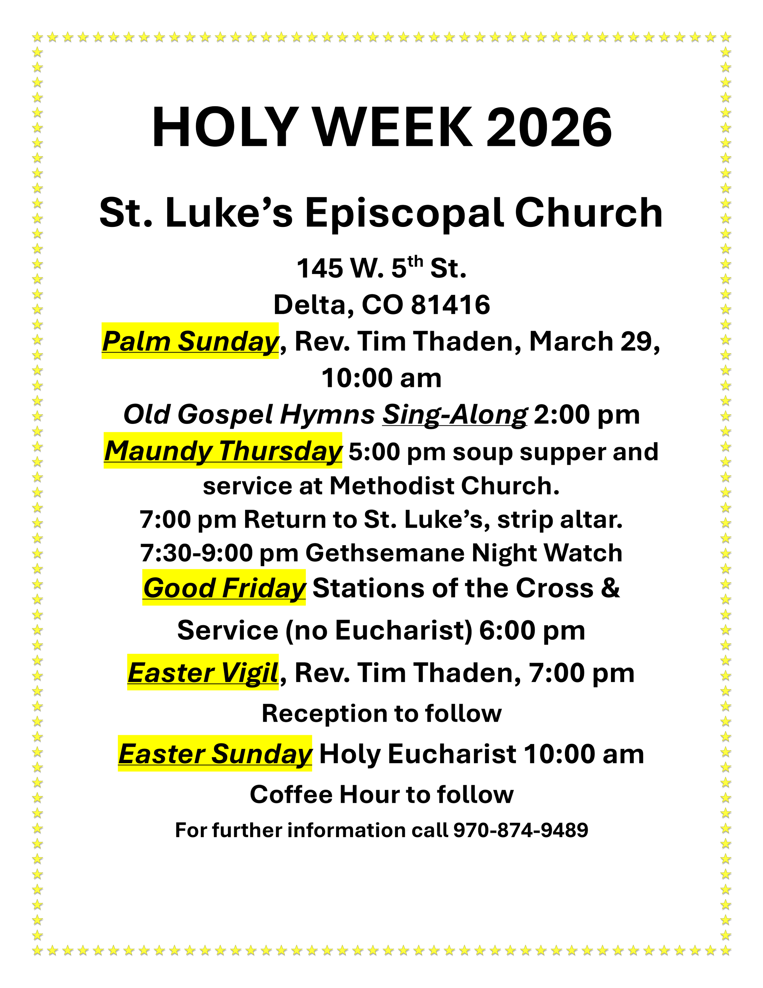 Holy Week 2026 Thursday, March 26, 2026 5:00 PM 17:00 Sunday, April 5, 2026 6:00 PM 18:00 Google Calendar ICS